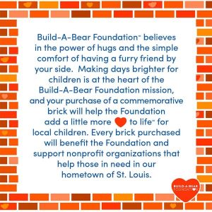 Build-A-Bear Foundation’s mission is to add a little more <3 to life by sharing hugs, inspiring creativity, and supporting those in need. for $250, your purchase of an 8×8 commemorative brick will benefit the Foundation and its goal to donate 125,000 furry friends and 125,000 books in 2022!