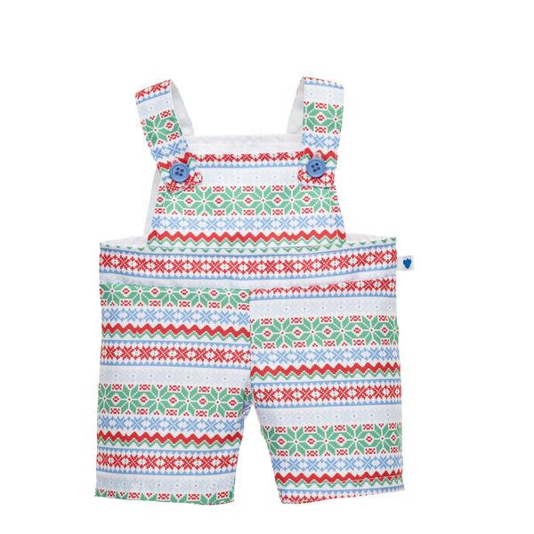 These stuffed animal overalls feature a colorful fair isle print pattern that’s perfect for the festive season.