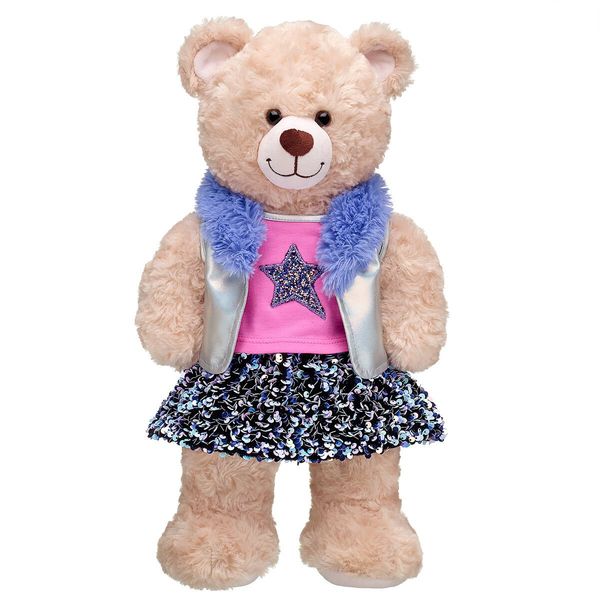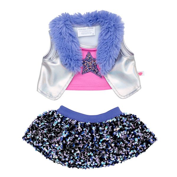 This two-piece outfit will have your Honey Girls friend ready to rock the stage! It includes a sequin skirt and purple fur trim metallic vest.