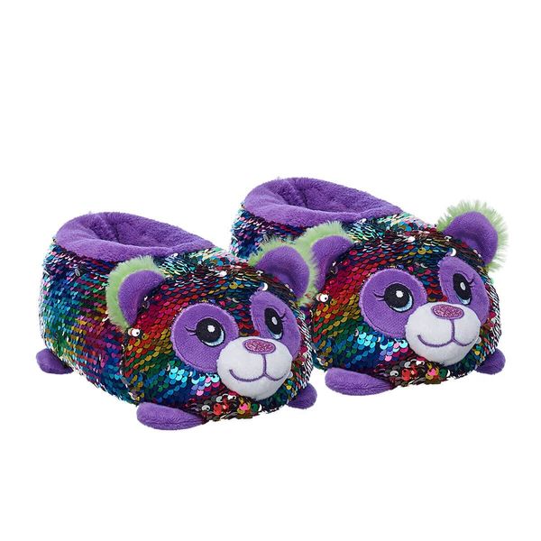 Keep paws warm with this adorable pair of panda slippers! These fun children’s slippers have friendly panda faces with shiny rainbow sequins. It’s a colorful way to put a little panda pep in your step!