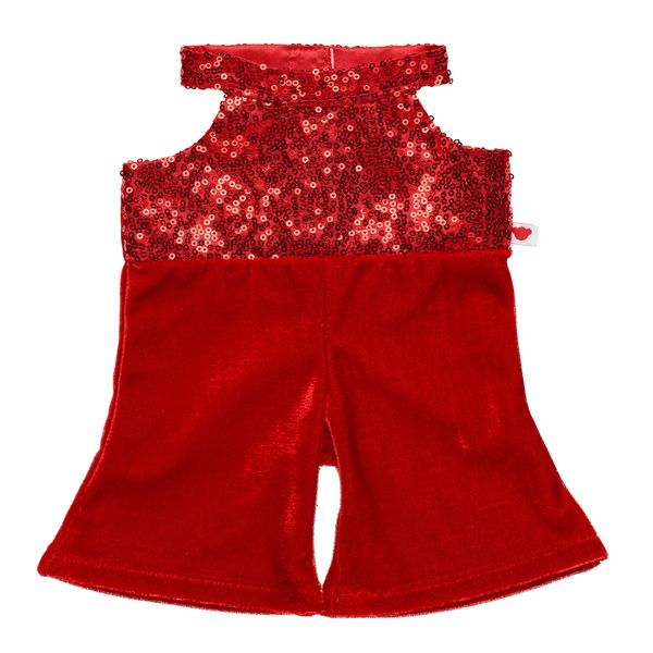 This stylish red jumpsuit has sparkly sequins on the top and velvet flared pants on the bottom.