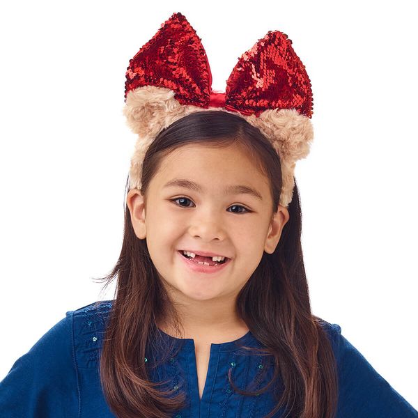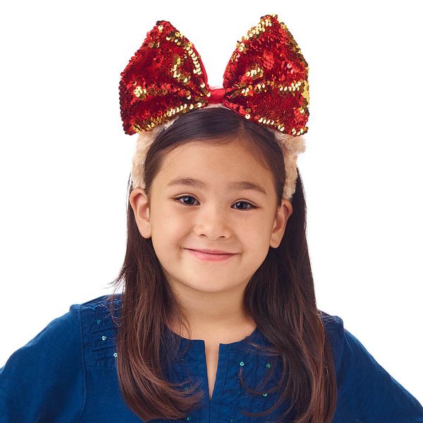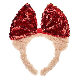 Wear your bear ears with some extra flair! This cute children’s headband has fuzzy brown bear ears with a festive bow on the top. The sequin bow flips from red to gold!