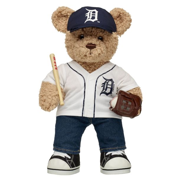 Batter up! Cheer on the Detroit Tigers with the help of this Timeless Teddy baseball bear gift set. This fuzzy brown bear is repping the Tigers with its baseball hat, team jersey, jeans and shoes included. It even comes with a bear-sized baseball glove, ball and plush bat to make a home run gift for Tigers fans!