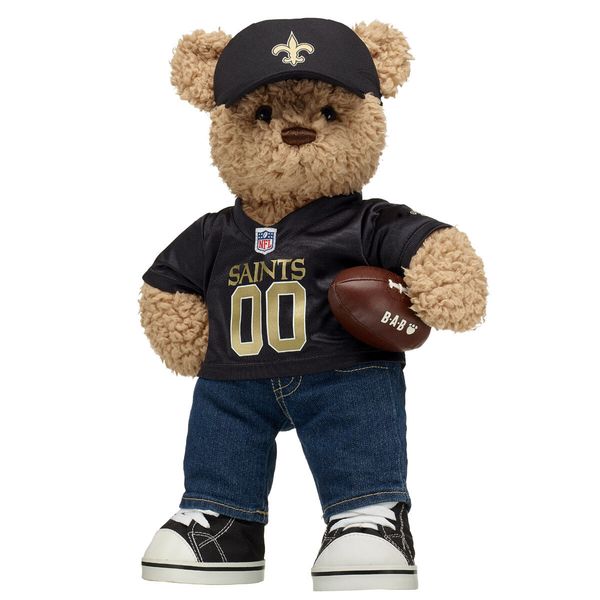 Go Saints! This teddy bear gift set makes a touchdown of a gift for football fans. It features Timeless Teddy ready for game day in its officially licensed New Orleans Saints jersey, fan hat, denim jeans and black shoes. This football bear also includes a plush BAB football to score big with the Saints fan in your life!